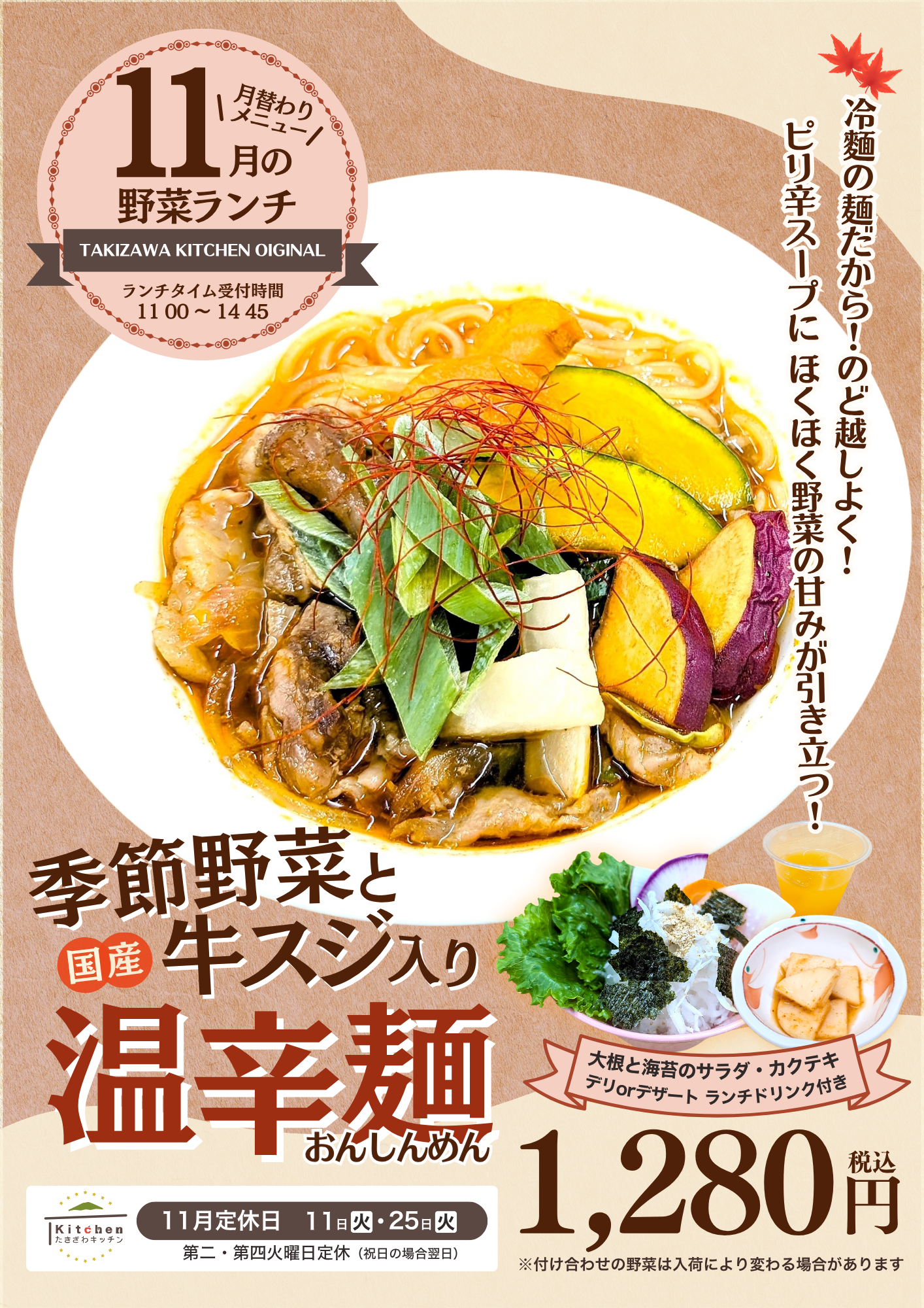 11月の野菜ランチは、『季節野菜と国産牛スジ入り温辛麵』です!