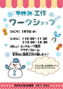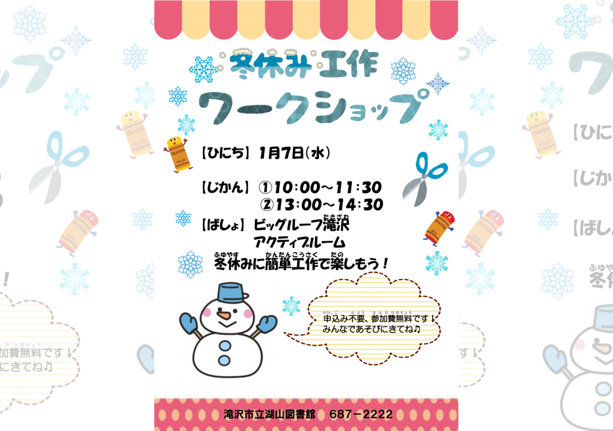 ダウンロード(PDF) イベントキッズ 湖山図書館 冬休み工作ワークショップ 2026-01-07 日程 1月7日(水) 開催時間 ①10:00~11:30 ②13:00~14:30 内容 冬休みに簡単工作で楽しもう! 場所 ビッグルーフ滝沢 アクティブルーム お申込み 不要 参加費 無料 お問合せ 滝沢市立湖山図書館 Tel:019-687-2222 チラシ