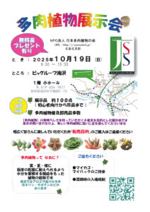 ダウンロード(PDF) 展示・販売 多肉植物展示会 2025-10-19 日程 10月19日(日) 開催時間 9:30~15:30 会場 ビッグルーフ滝沢 小ホール お問合せ NPO法人 日本多肉植物の会 北東北支部 ホーム チラシ