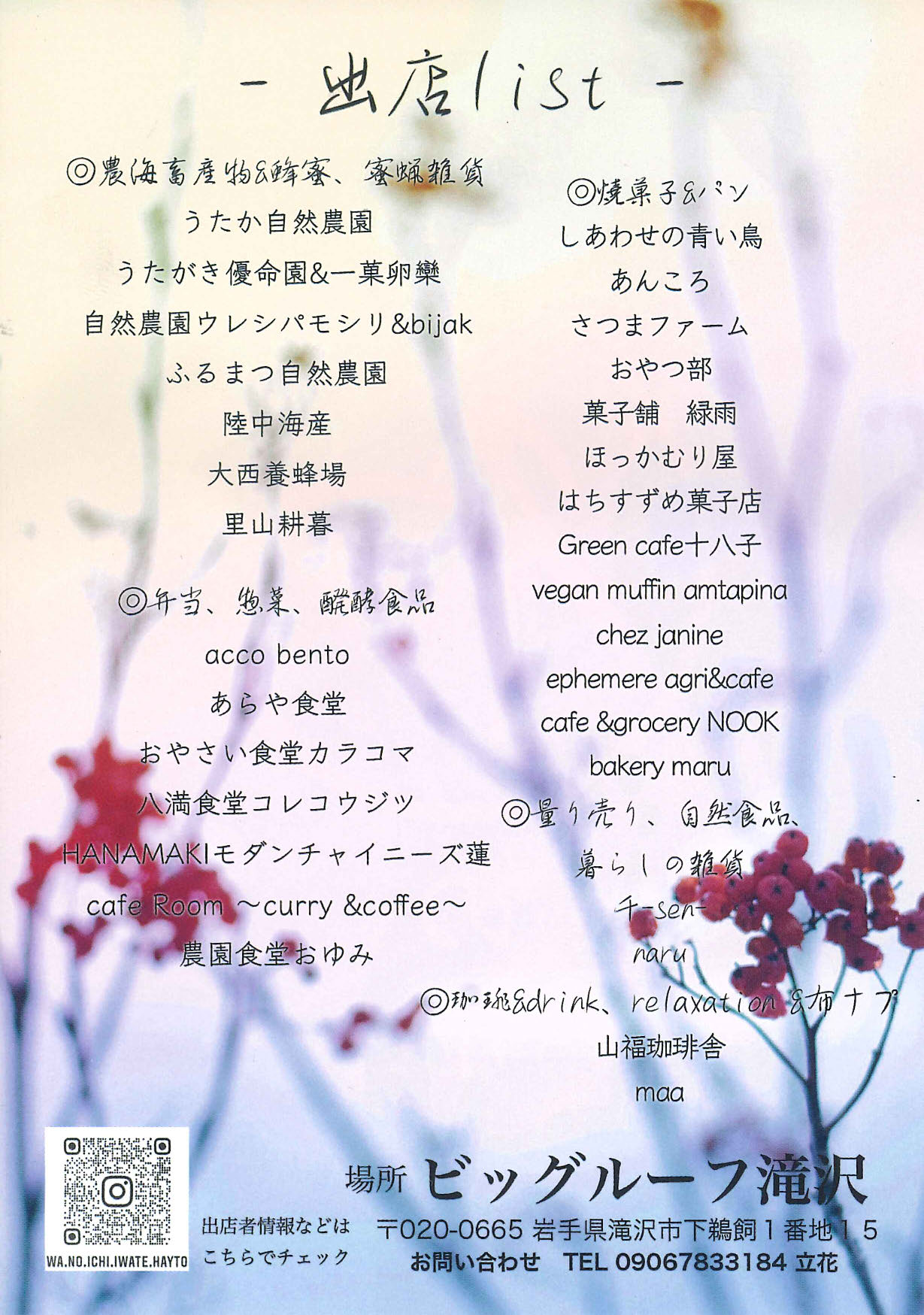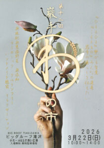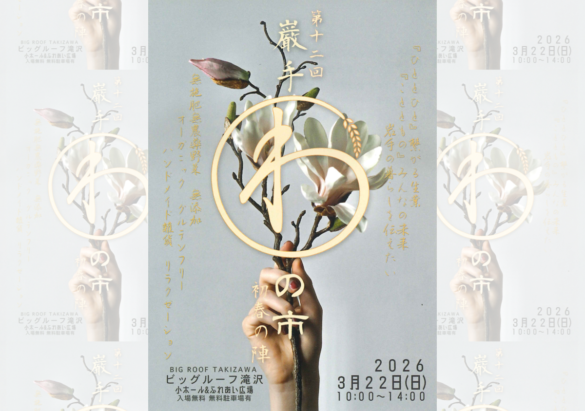 ダウンロード(PDF) マルシェ 第十二回巌手わの市 2026-03-22 日程 3月22日(日) 開催時間 10:00~14:00 会場 ビッグルーフ滝沢 小ホール・ふれあい広場 お問合せ 090-6783-3184(立花) チラシ