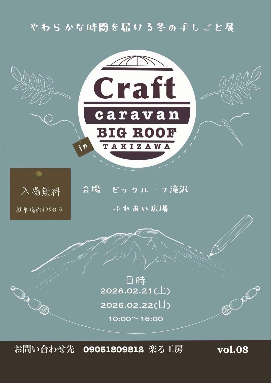 ダウンロード(PDF) マルシェ Craft caravan in BIGROOF TAKIZAWA 2026-02-21 日程 2月21日(土) 2月22日(日) 開催時間 10:00~16:00 会場 ビッグルーフ滝沢 ふれあい広場 お問合せ Tel:090-5180-9812(楽る工房) チラシ