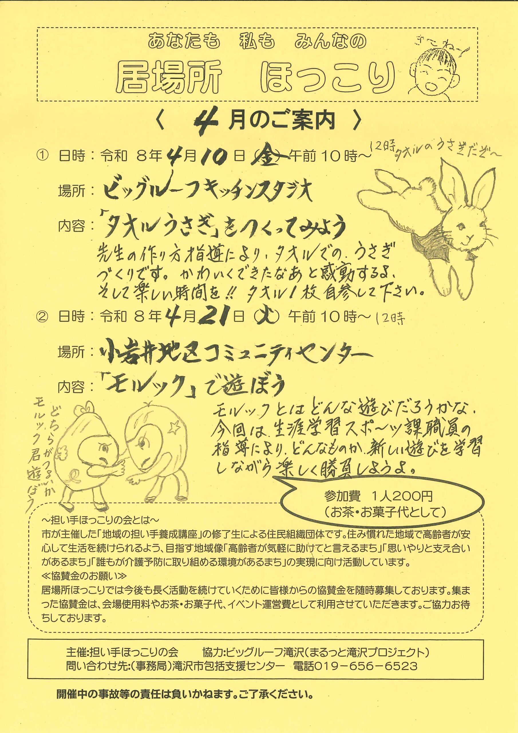 居場所づくりや生活支援に取り組む住民ボランティア組織「担い手ほっこりの会」による、居場所ほっこりが行われます。