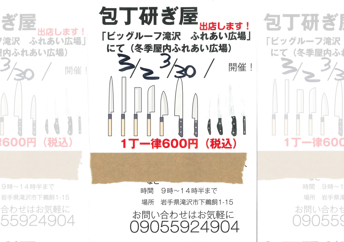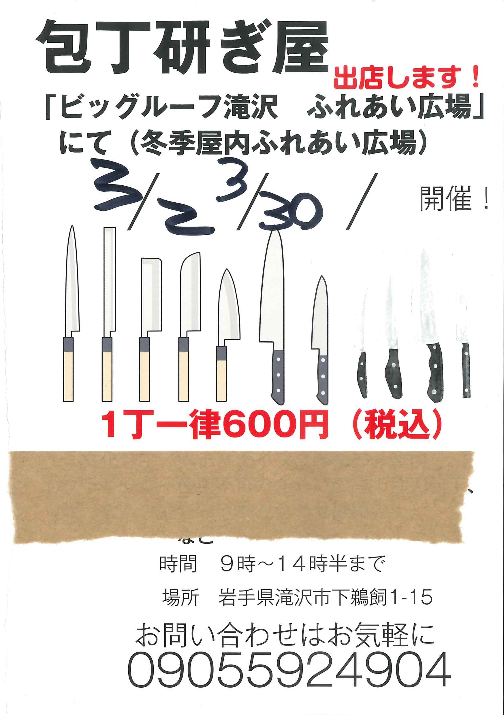 ダウンロード(PDF) 展示・販売 包丁研ぎ屋【3月30日】 2026-03-30 日程 3月30日(月) 開催時間 9:00~14:30 会場 ビッグルーフ滝沢 ふれあい広場・たきざわ広場 (受付は屋内 ふれあい広場にて) お問合せ Tel:090-5592-4904 チラシ