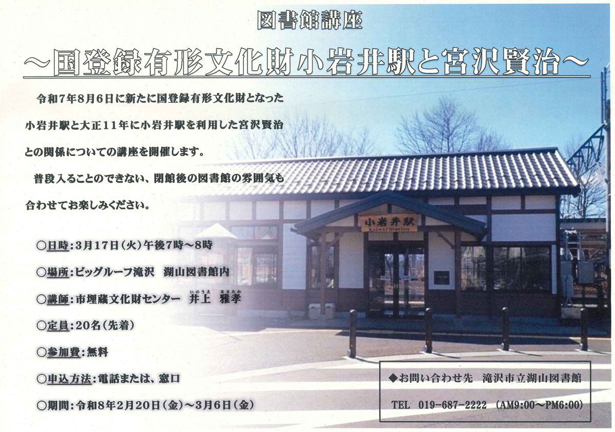 令和7年8月6日に新たに国登録有形文化財となった小岩井駅と大正11年に小岩井駅を利用した宮沢賢治との関係についての講座を開催します。