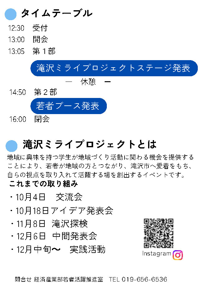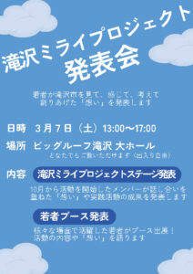 滝沢ミライプロジェクトは、滝沢市に関わりたい高校生や大学生の皆さんがテーマ別のチームに分かれ滝沢市を見て感じて考えて「想い」をプレゼンテーションすることを目的としたものです。