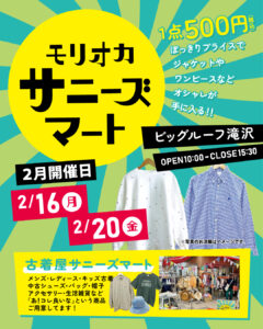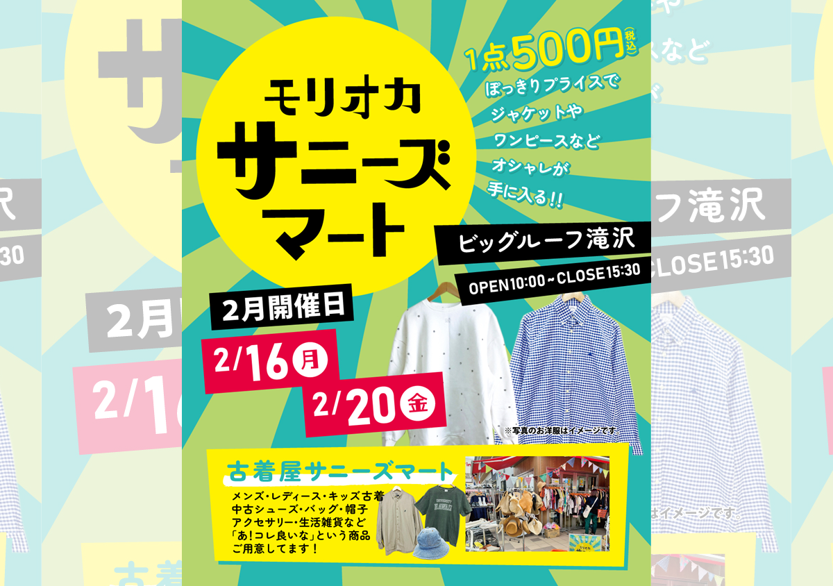 ダウンロード(PDF) マルシェ モリオカサニーズマート【2月20日】 2026-02-20 日程 2月20日(金) 開催時間 10:00~15:30 会場 ビッグルーフ滝沢 ふれあい広場 お問合せ サニーズマート Instagram @sunnys_mart チラシ @sunnys_mart @oishisashop_san