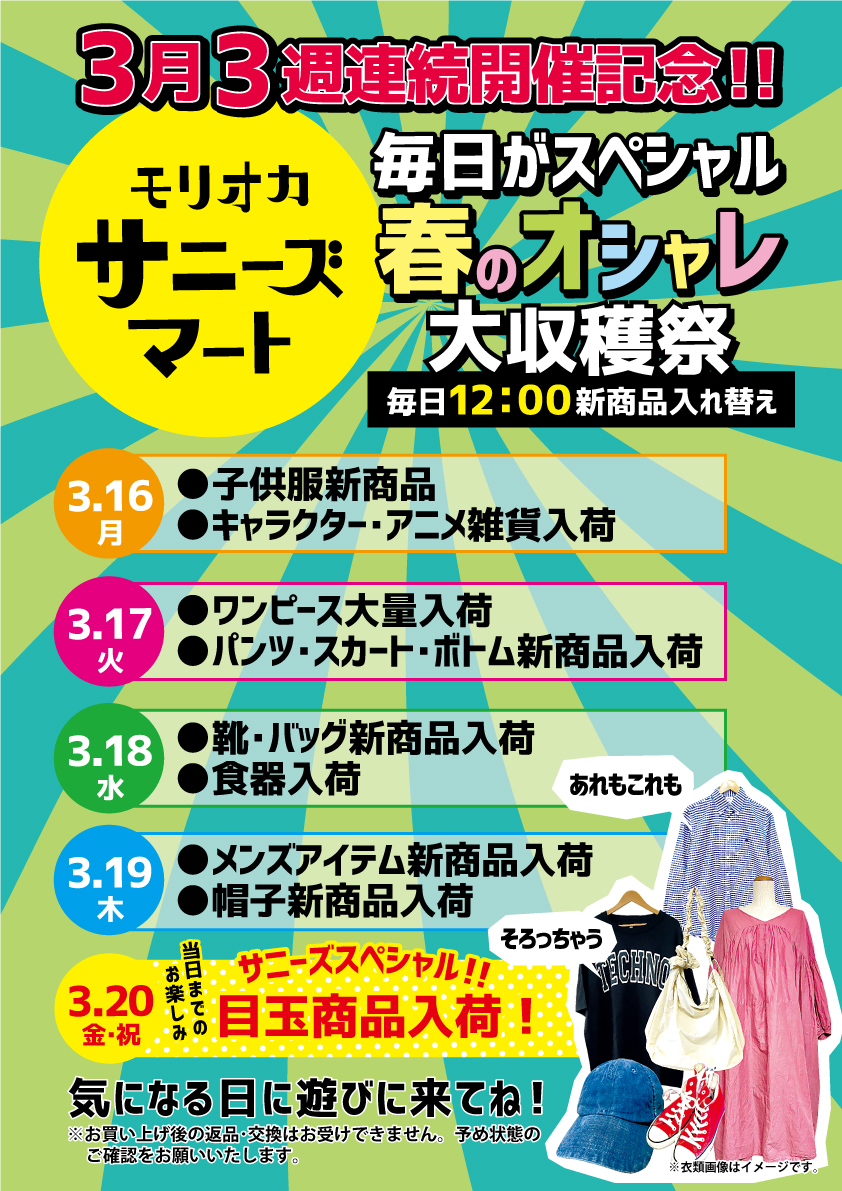 ダウンロード(PDF) マルシェ モリオカサニーズマート【3月16日~20日】 2026-03-18 日程 3月16日(月)~20日(金) 開催時間 10:00~15:30 会場 ビッグルーフ滝沢 ふれあい広場 お問合せ サニーズマート Instagram @sunnys_mart チラシ @sunnys_mart @oishisashop_san