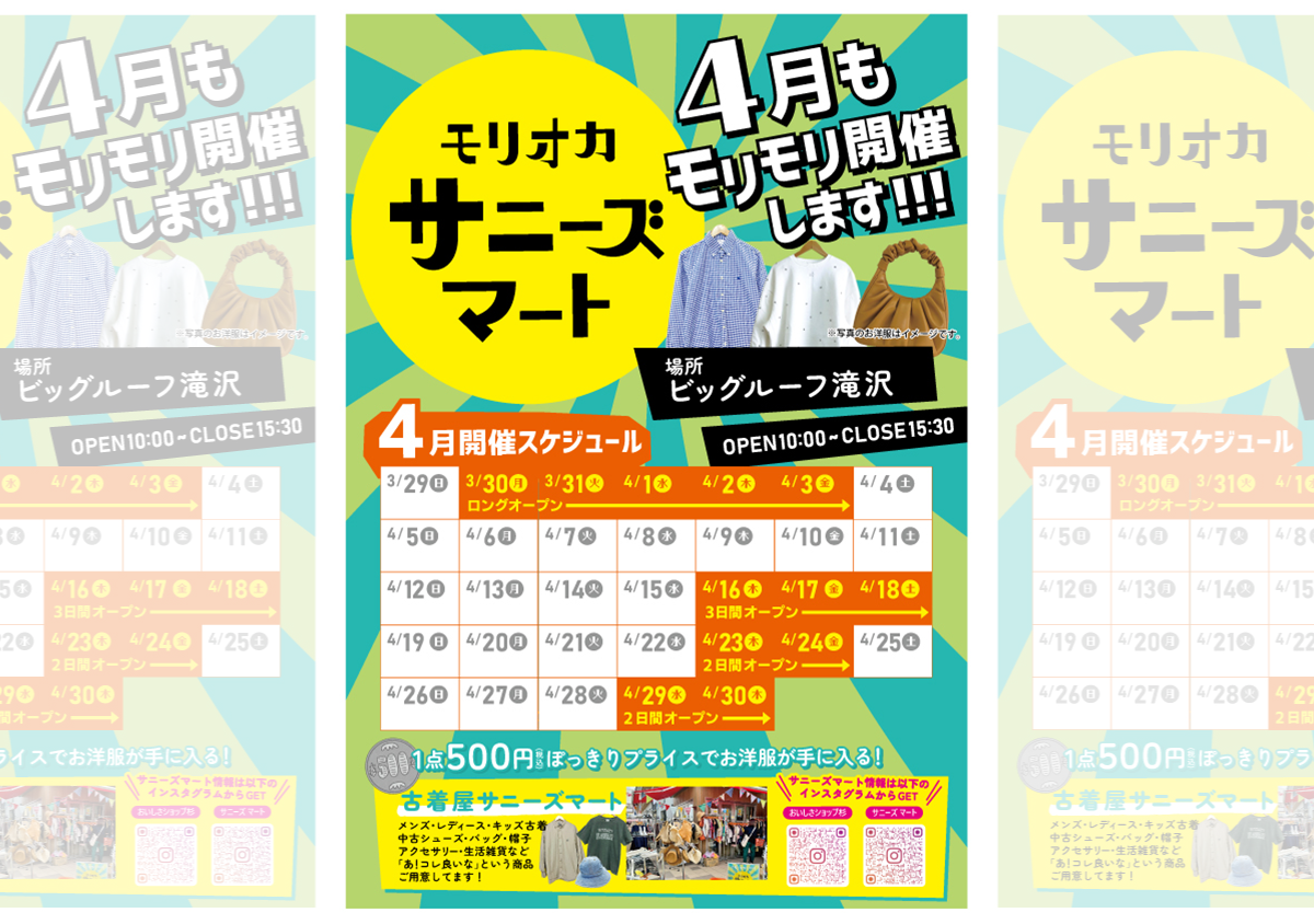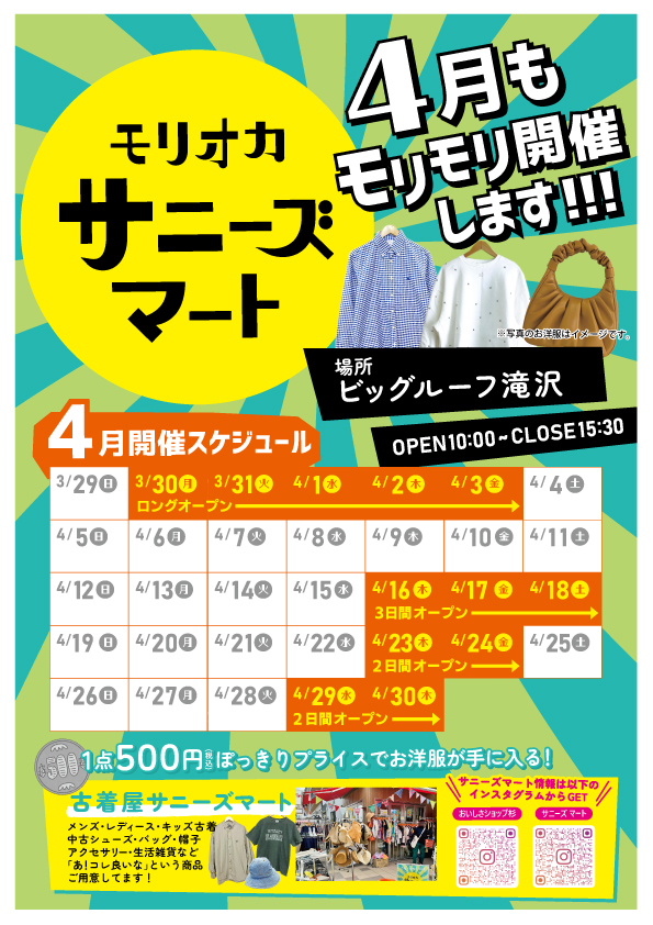 ダウンロード(PDF) マルシェ モリオカサニーズマート【4月23日~4月24日】 2026-04-24 日程 4月23日(木)~4月24日(金) 開催時間 10:00~15:30 会場 ビッグルーフ滝沢 ふれあい広場 お問合せ サニーズマート Instagram @sunnys_mart チラシ @sunnys_mart @oishisashop_san
