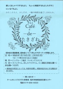 認知症カフェは、認知症のご本人やご家族、認知症について相談できる人がいない方、認知症についてもっと知りたい方などが、気軽に集い、楽しい時間を過ごしながら、仲間づくりや情報交換、専門スタッフに相談ができる場です。